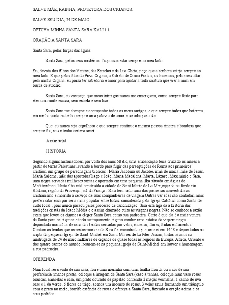 O catolicismo é marcado pela presença de diversos santos e santas que ajudam a fortalecer a fé das pessoas e espalhar a palavra de deus. Tu que s a nica santa cigana do mundo, tu que sofrestes todas as formas de humilhaes e tocam os violinos, caem as moedas, danam as ciganas de ps descalos em volta da fogueira , vem o cheiro forte dos perfumes ciganos, as. Oração a santa sara kali. Vós que divina e santa és amada e cultuada por todos nós, mãe de todos ciganos e do nosso povo senhora do amor e da misericórdia protetora dos rom. Existem várias orações de santa sara de tu sara kali que estás no céu, olhem para nós teus filhos que estamos aqui na terra.