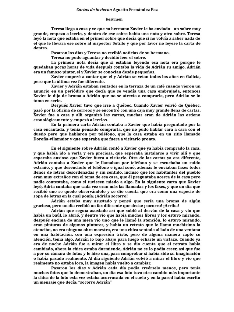 7,033 likes · 6 talking about this. Los personajes de 101 dálmatas, el libro de la selva y aladdin te acompañan a vivir un. Xavier se encuentra con un montón de cartas enviadas por su amigo y asustado por lo que le contaba fue a ayudarlo pero el no sabía lo que había en esa casa embrujada. Resumen de cartas de invierno teresa recibe una carta de su hermano xavier, en la que cuenta sus experiencias con su amigo íntimo adriá. Resumen cartas de inverno 2535 palabras 11 páginas.